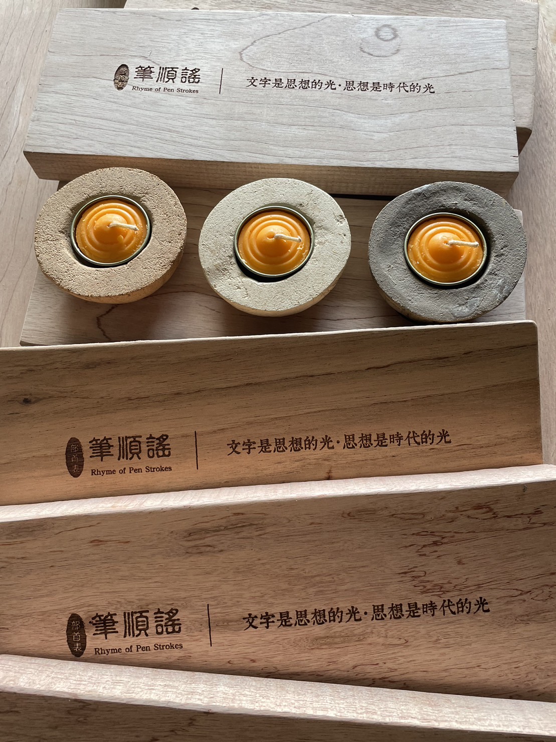大伙房書院訂製了三入泥燭杯為一組加贈底座的募資回饋品。很感謝書院院長-鄭老師,喜歡風中之星的設計概念,「點亮心中那盞光」,是風中之星對泥燭杯的詮釋。更呼應筆順謠贊助的人們,共同響應點燃文字帶來的思想之光。